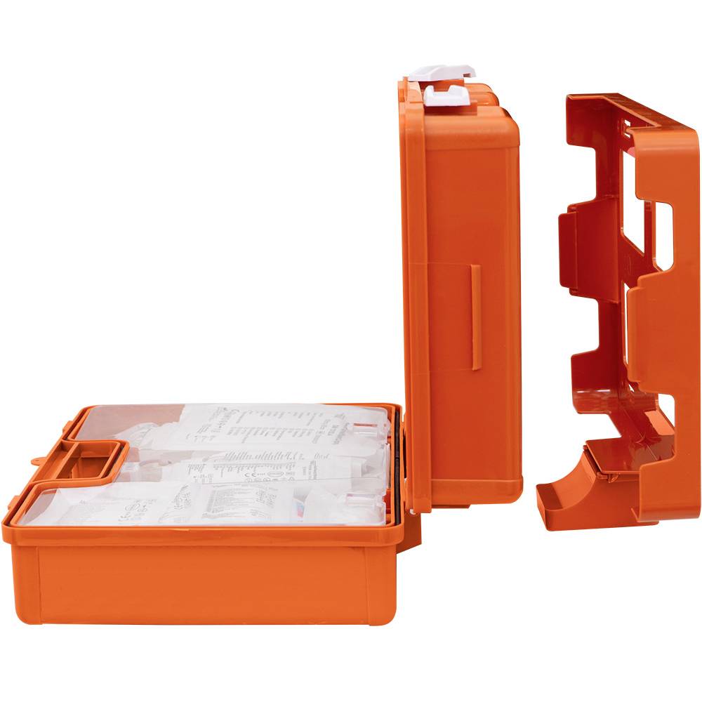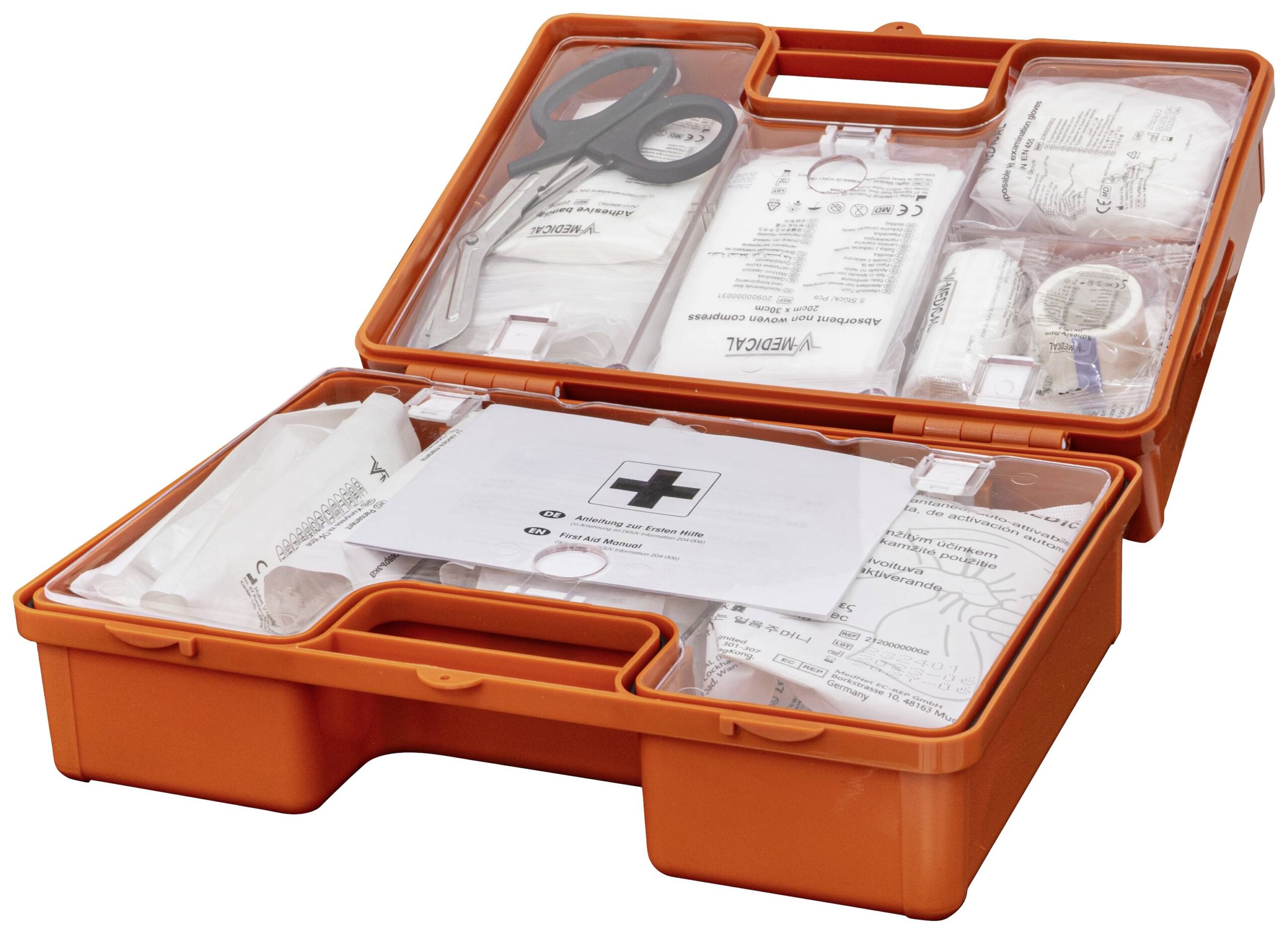 Der PETEX Betriebsverbandkasten „“Profi““ ist ideal für Unternehmen und Arbeitsumgebungen konzipiert worden. Gemäß den strengen Standards der DIN 13157:2021, ist dieser Kasten in auffälligem Orange gehalten, was seine Sichtbarkeit und Auffindbarkeit im Notfall deutlich verbessert. Ausgestattet mit einem robusten Kunststoffkoffer und einem praktischen Tragegriff, bietet der Betriebsverbandkasten „“Profi““ nicht nur sicheren Transport, sondern auch zuverlässige Aufbewahrung für seinen Inhalt. Dank übersichtlicher und flexibler Trennfächer bleiben Verbände, Pflaster und Desinfektionsmittel stets geordnet und leicht zugänglich. Eine integrierte Gummidichtung schützt den Kasten vor Feuchtigkeit und Spritzwasser, während die mitgelieferte Wandhalterung mit 90° Arretierung eine einfache Montage und schnellen Zugriff gewährleistet. Trotz seiner kompakten Größe von etwa 28 x 11,5 x 20 cm bietet der Kasten eine umfassende Erste-Hilfe-Ausstattung für verschiedene Arbeitsumgebungen. Zusätzlich zu seinem umfangreichen Inhalt enthält der Betriebsverbandkasten „“Profi““ fünf praktische Aufkleber, darunter Kennzeichnungssticker gemäß ISO 7010 sowie Hinweise zum richtigen Verhalten im Brandfall und bei Unfällen. Ein Kasten ist nach DGUV ausreichend für: Verwaltungs- und Handelsbetriebe mit 1 bis 50 Mitarbeiter, Herstellungs- und Verarbeitungsbetriebe mit 1 bis 20 Mitarbeiter sowie Baustellen mit 1 bis 10 Mitarbeiter. Mit dem PETEX Betriebsverbandkasten „“Profi““ sind Sie optimal auf den Ernstfall vorbereitet.