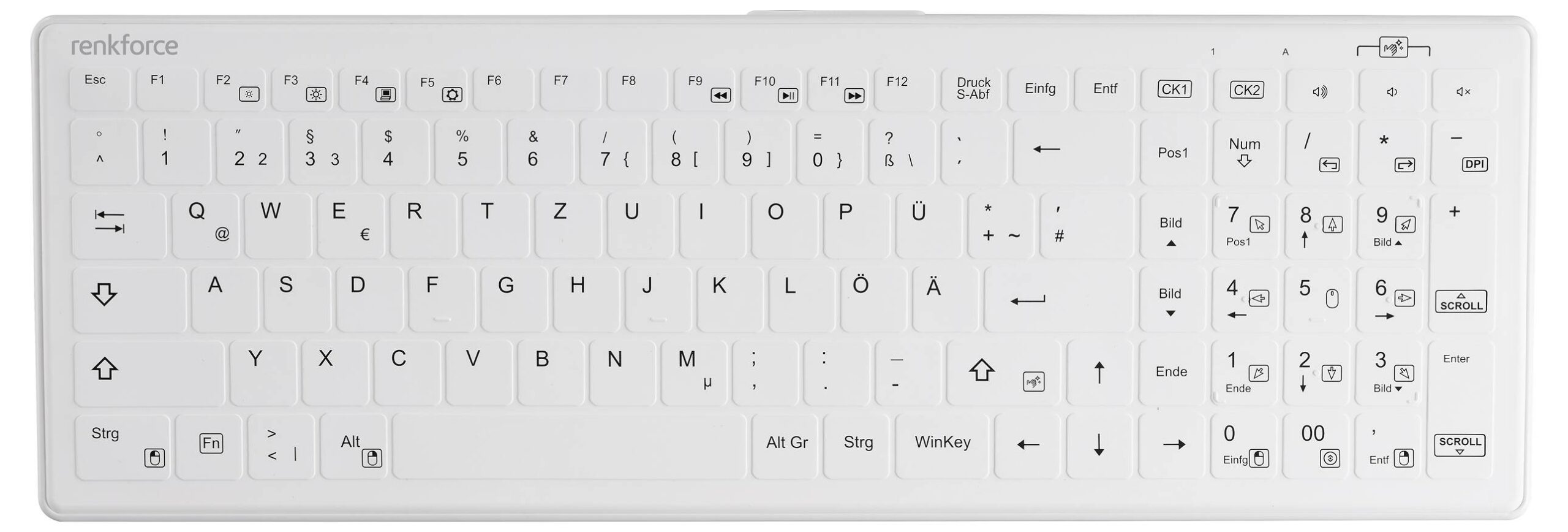 Renkforce RF-WPIK-500 Wasserbeständige USB-Hygiene-Tastatur Die wasserbeständige Tastatur nach IP65 mit ihrer glatten Silikonhülle ist die perfekte Lösung für alle, die Wert auf Sauberkeit und einfache Reinigung legen. Ob im medizinischen Bereich, in der Lebensmittelindustrie oder im Labor – diese Tastatur hält hohen hygienischen Anforderungen stand. Das spaltfreie Gehäuse lässt sich im Handumdrehen reinigen. Die Tastatur besteht aus hochwertigem, BPR gelistetem antimikrobiellem Silikon, das das Bakterienwachstum hemmt und für zusätzliche Sicherheit sorgt. Ideal z.B. für Krankenhäuser und Arztpraxen, Lebensmittelverarbeitung, Labore, Reinräume und überall dort, wo Hygiene wichtig ist!““