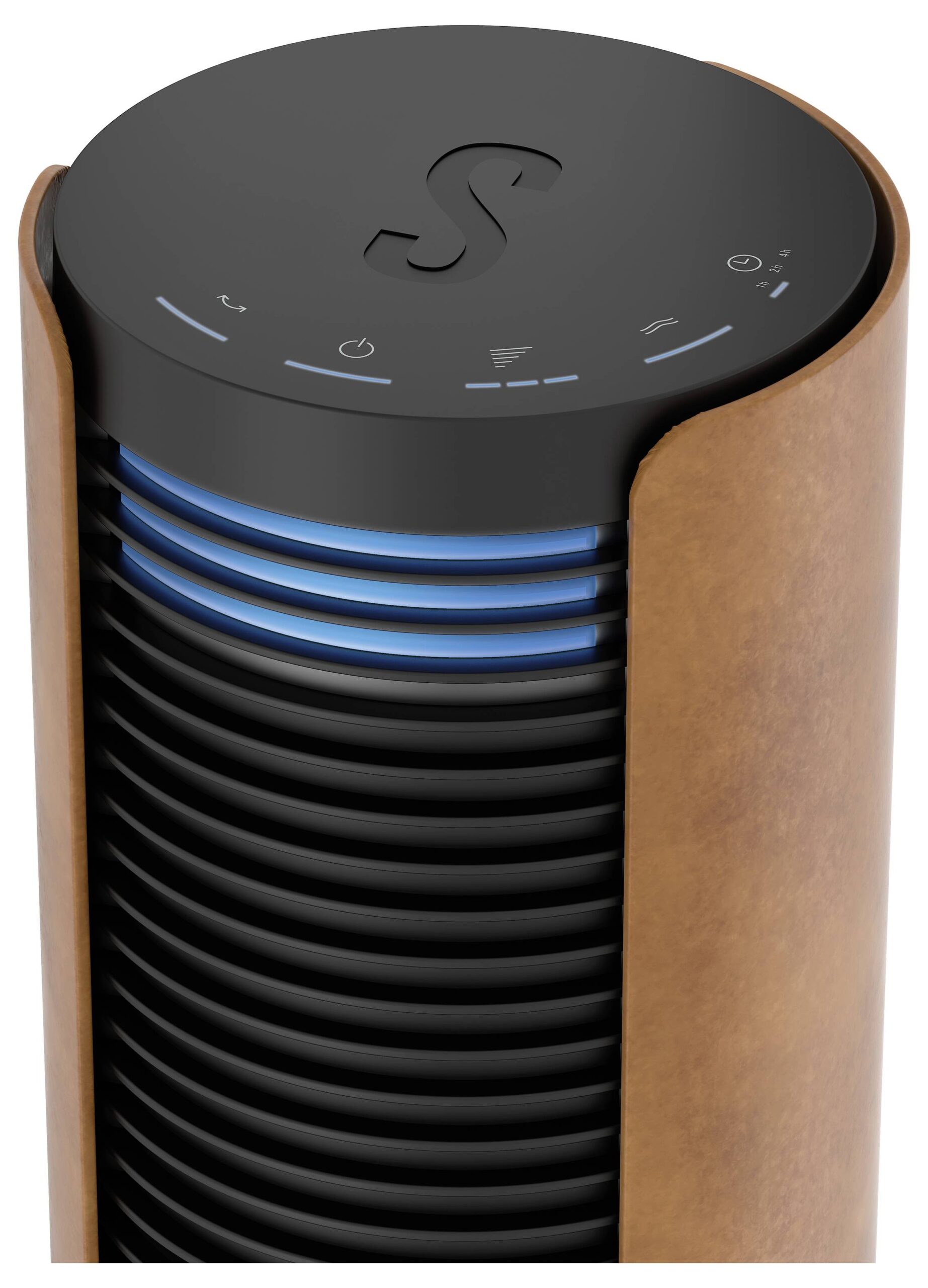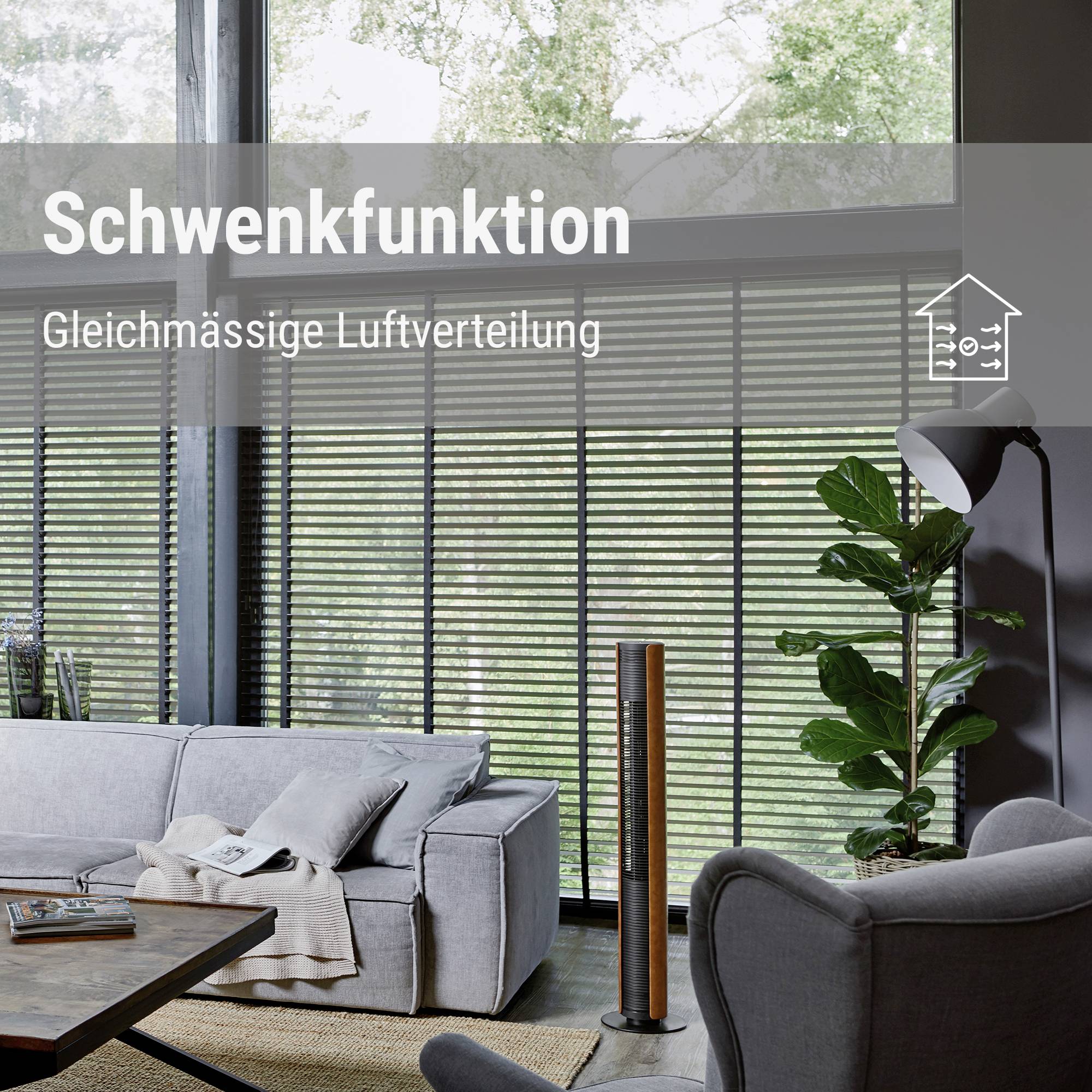 Mit seinem stilvollen Äusseren setzt sich Peter leatherette gekonnt in Szene. Seine cognac-farbene Kunstlederoberfläche lässt sich mit jedem Einrichtungsstil kombinieren. Der Ventilator verrichtet seine Arbeit energieeffizient und leise. Dank seiner schlanken Form findet Peter auf kleinster Fläche Platz und sorgt mit seiner Schwenkfunktion für gleichmässig verteilte Luft. Peter leatherette ist individuell einstellbar, verfügt über einen 1 bis 7 h Timer und einen Modus für natürliche Brise. Optimal fürs Schlafzimmer Dank seinen dimmbaren LEDs und dem leisen Betrieb eignet sich Turmventilator Peter leatherette ausgezeichnet fürs Schlafzimmer. Sechs Geschwindigkeitsstufen Peter leatherette verfügt über sechs verschiedene Geschwindigkeitsstufen und lässt sich daher individuell an die eigenen Bedürfnisse anpassen. Einfache Bedienung Der Turmventilator kann ganz einfach über das Touch Panel durch eine leichte Berührung gesteuert werden. Die Bedienung ist zudem mittels komfortabler Fernbedienung möglich.