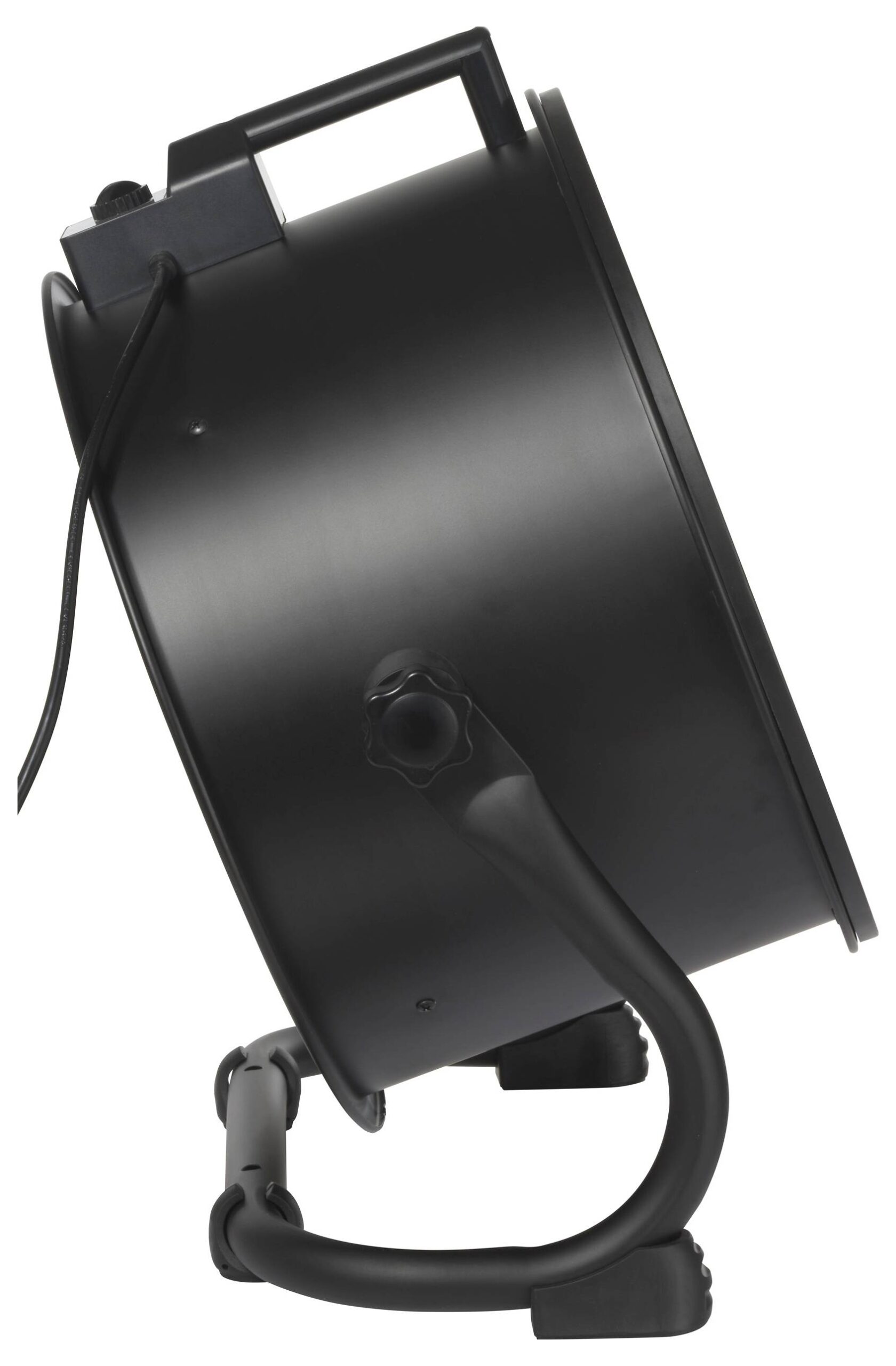 Frische Brise an heißen Tagen Mit dem Sygonix Trommelventilator kommt frischer Wind an den Arbeitsplatz. Der Luftdurchsatz kann in drei verschiedenen Stärken eingestellt werden, wobei sich der Ventilator mit den drei präzisionsgewuchteten Metallflügeln um 360 Grad neigen lässt. So lassen sich auch größere Flächen wie Werkstätten, Geschäfte und Lagerräume gezielt kühlen. Die Steuerung des 120 Watt starken Geräts erfolgt über einen unkompliziert zu bedienenden Drehschalter. Robuste und praktische Hardware Dank moderner Aluminiumwicklungen bringt der Motor nur wenig Gewicht auf die Waage, wodurch der Ventilator mittels des integrierter Tragegriffs schnell und einfach an jedem beliebigen Ort aufgestellt ist. Ein stabiler Bodenständer mit Gummifüßen verleiht dem Metallgehäuse des Sygonix Trommelventilator sicheren Stand. Schnelle, einfache Montage Der Trommelventilator wird mit Bodenständer, dazugehörigen Fixierschrauben und Unterlegscheiben sowie einer Bedienungsanleitung geliefert.